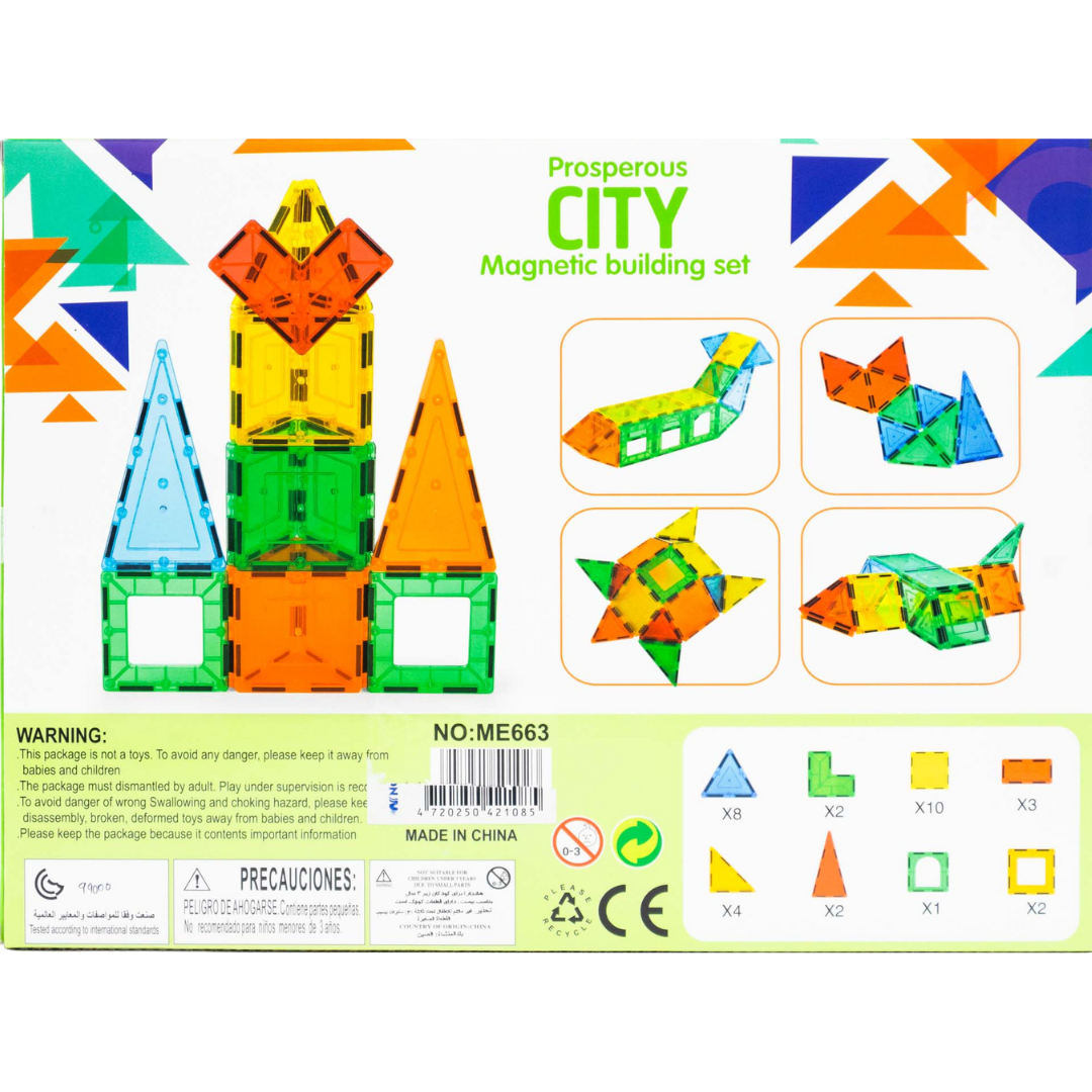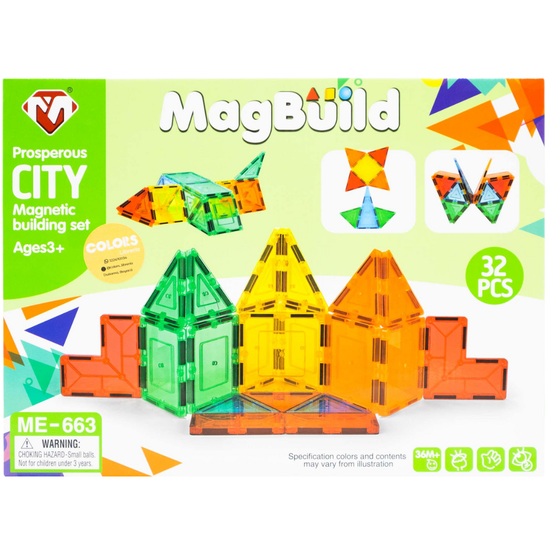 Set de bloques magnéticos de colores para armar figuras en 2D y 3D, ideal para estimular la imaginación y el pensamiento espacial.