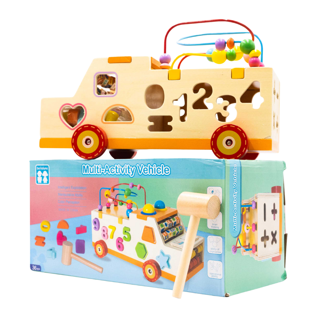 Camión de madera con laberintos, figuras y martillo para desarrollar la motricidad fina, la coordinación y la lógica.
